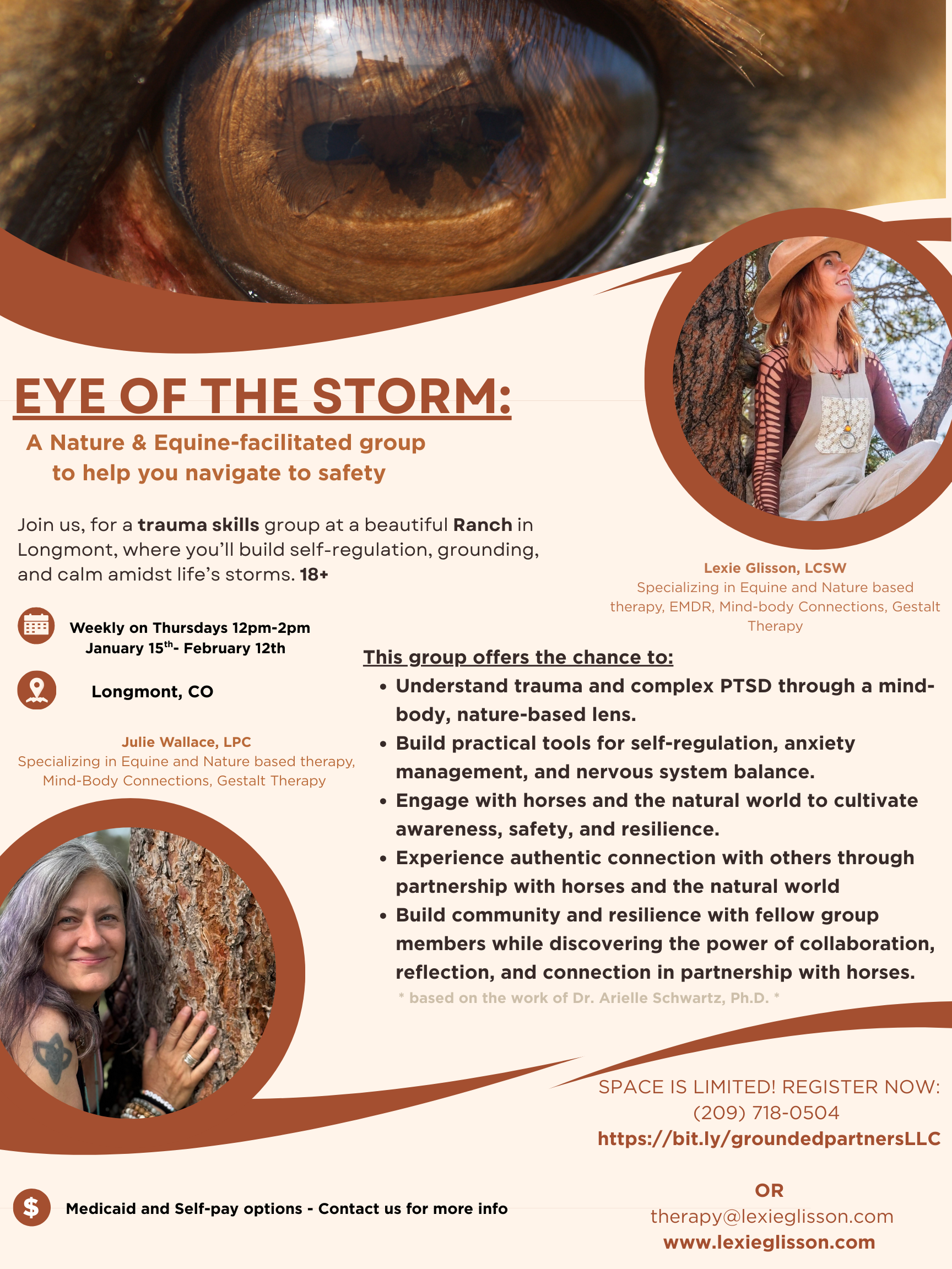 Set against the stunning backdrop of Colorado's natural landscape, participants will engage in powerful equine-assisted activities, group discussions, and nature-based therapeutic exercises that foster self-discovery and emotional resilience.